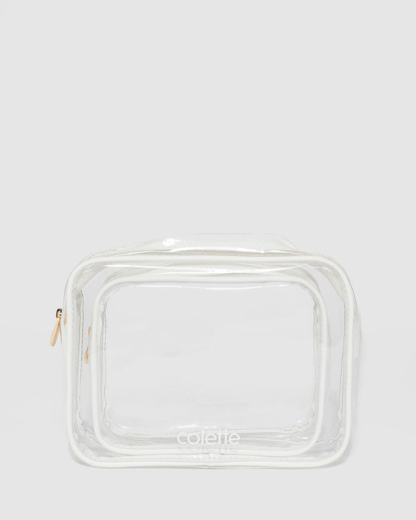 Part of our Travel And Gift collection Main carry case Clear PVC finish with Gold tone hardware Ivory vegan leather trim Zip closure Measurements: H15cm x W24cm x D6cm Small...