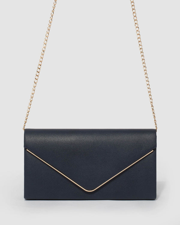 Part Of Our Marry Me Collection Navy blue finish with gold tone hardware Vegan Leather Metallic closure Detachable chain shoulder strap Internal slip pocket Black lining with colette by colette...