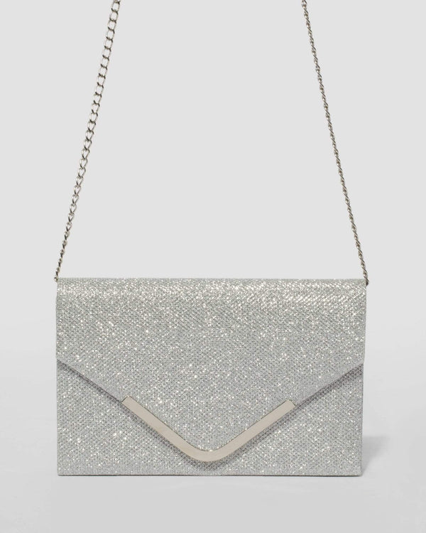 Part of our Silver Sparkle collection Silver finish with silver tone hardware Glitter material Magnetic closure Internal slip pocket Detachable chain shoulder strap White nylon lining with colette by colette...