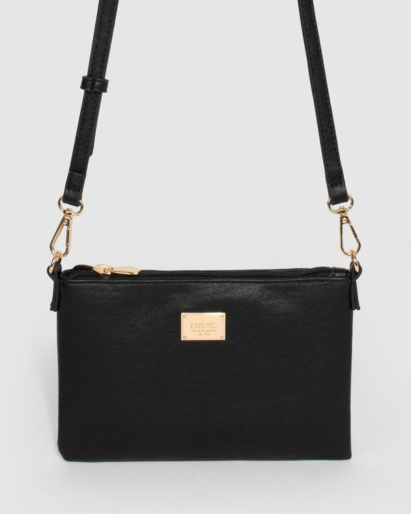 Part of our Crossbody Classics collection Black finish with gold tone hardware Smooth faux leather Magnetic dot secures main compartment Internal zipped pocket Detachable adjustable shoulder straps Black nylon lining with...