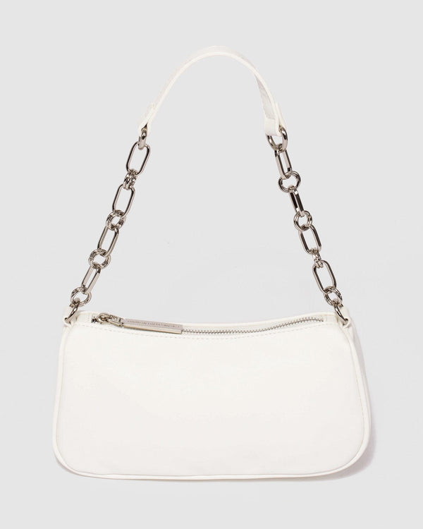 Part of our Sophie collection White finish with silver tone hardware Textured vegan leather Magnetic closure Internal slip pocket Detachable chain shoulder strap White lining with colette by colette hayman...
