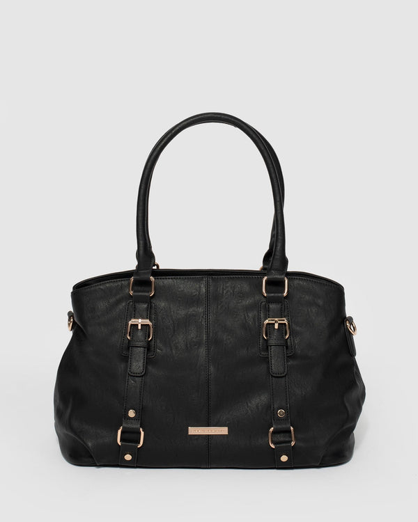 Part of our Blackoutcollection Black finish with gold tone hardware Smooth textured faux leather Zip closure secures 3 main compartments Internal zip, slip and mobile phone pocket Detachable adjustable shoulder...