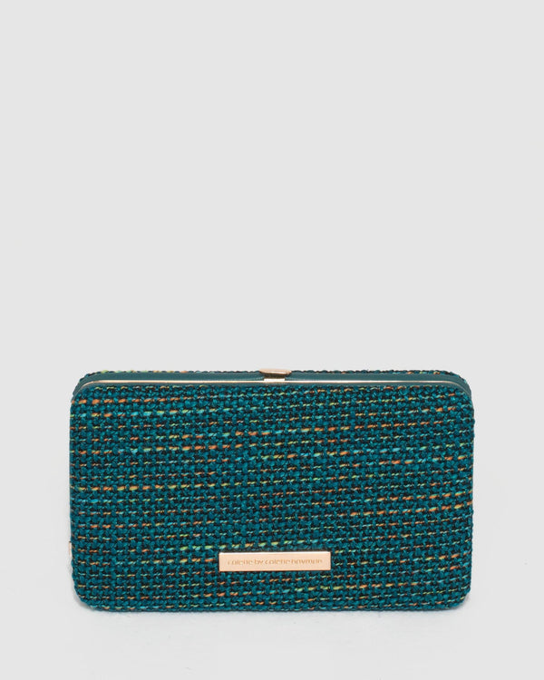 Part of our Blue Lagoon collection Blue finish with gold tone hardware Woven finish Push lock closure 7 Internal card slots Clear photo ID window Elasticated slot fits most phones...