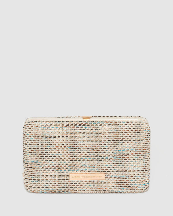 Part of our Blue Lagoon collection Multi colour finish with gold tone hardware Woven finish with textured faux leather Zip closure with foldover flap secured by magnet Internal zip, slip...