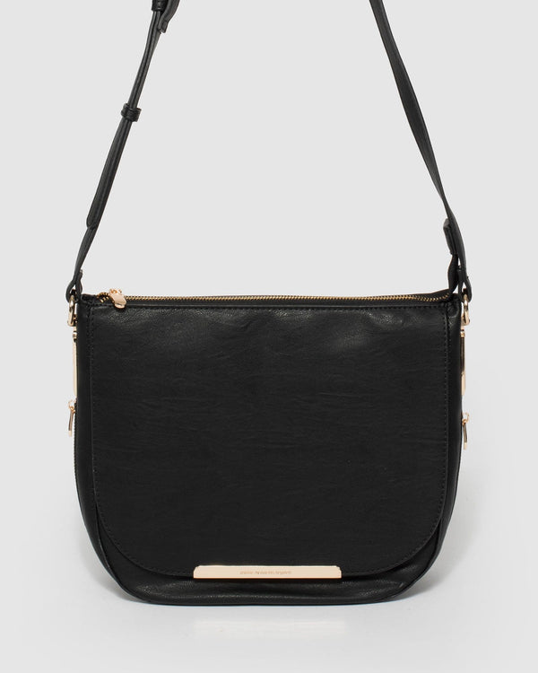 Part of our Land of Splendour collection Black finish with gold tone hardware Smooth textured pu material Zip closure External slip pocket under magnetic flap Internal zip and slip pocket Adjustable...
