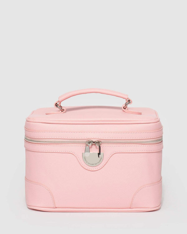 Part of our Gift Me collection Pink finish with silver tone hardware Saffiano textured faux leather Zip around closure Opens to two additional removable zipped cosmetic cases Large removable case...