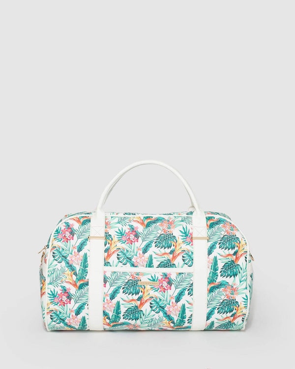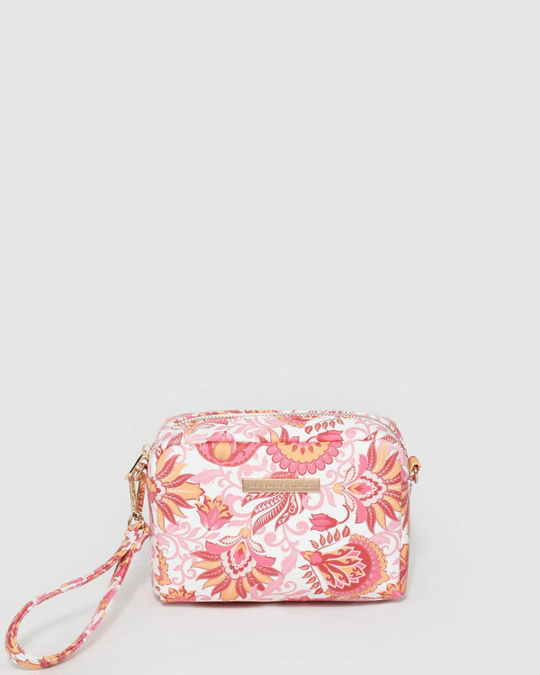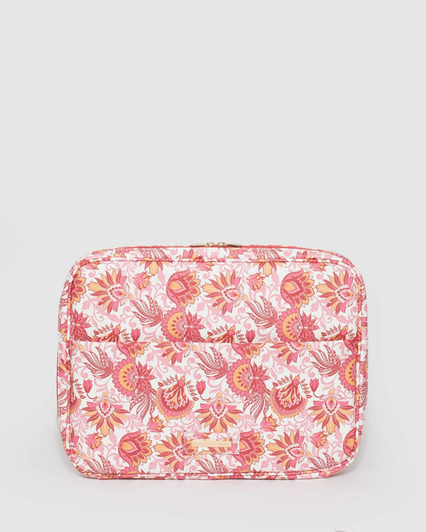 Part of our Gift Me collection Pink Tropical Print finish with gold tone hardware Pink tropical print canvas material Zip closure Structural bar pops out External zip pocket Internal slip...