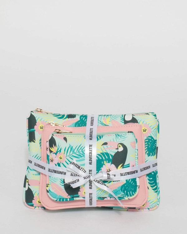 Part of our Gift Me collection Toucan Print finish with gold tone hardware Toucan print faux saffiano leather Zip closure Set of three purses wrapped in ribbon Great gift idea!...