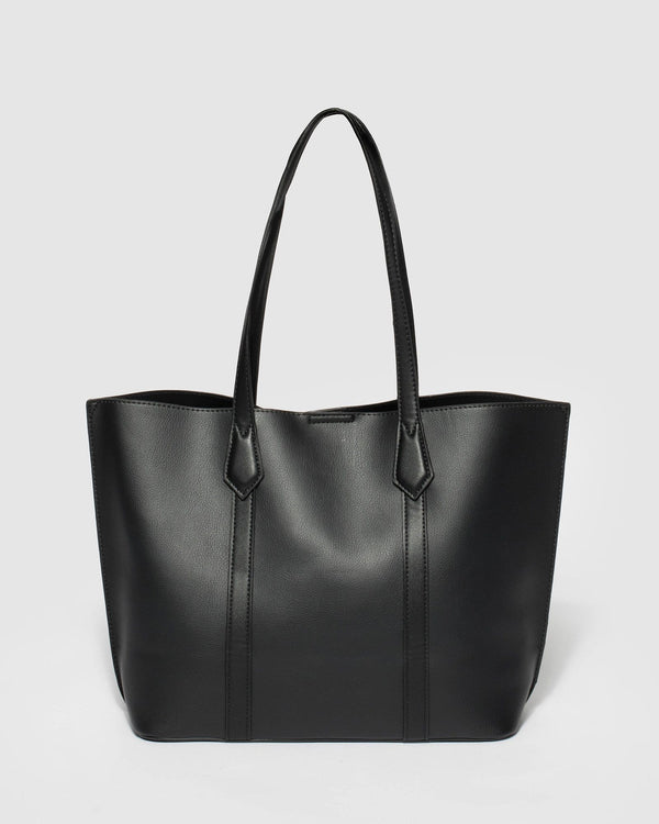 Part of our Angelina Classics collection Black finish with silver tone hardware Smooth textured vegan leather Removable pouch/laptop case contains external fold over flap to slip compartment Removable pouch/laptop case measures H24.07cm...