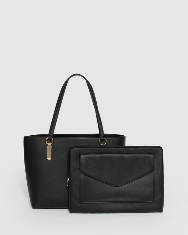 Part of our Angelina Classics collection Black finish with gold tone hardware Smooth textured faux leather finish Removable pouch contains external fold over flap to slip compartment Removable pouch/laptop case; fits...