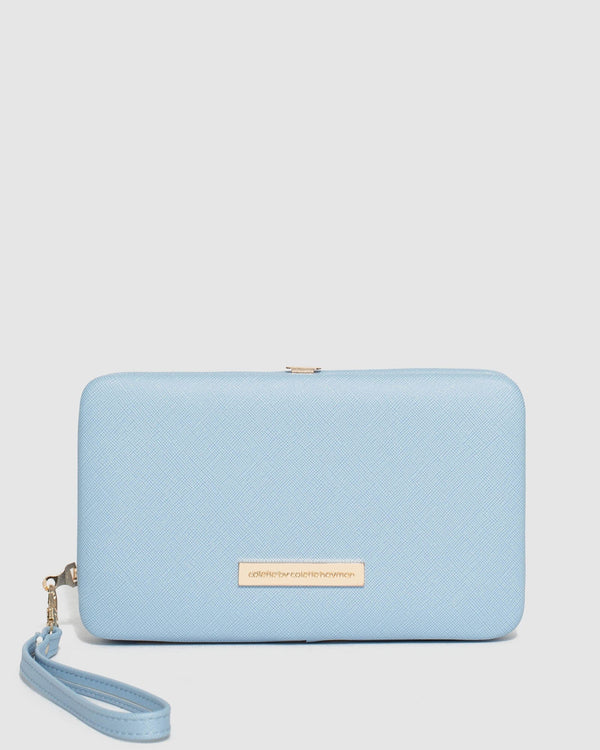 Part of our Senorita collection Blue finish with gold tone hardware Textured faux leather Push lock closure 7 card slots Clear photo ID window Elasticated slot fits most phones Zipped...