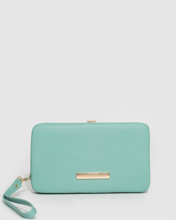 Part of our Motherly Love collection Teal finish with gold tone hardware Textured faux leather Push lock closure 7 card slots Clear photo ID window Elasticated slot fits most phones...