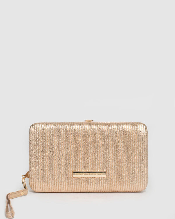 Part of our Motherly Love collection Gold finish with gold tone hardware Textured faux leather Push lock closure 7 card slots Clear photo ID window Elasticated slot fits most phones...