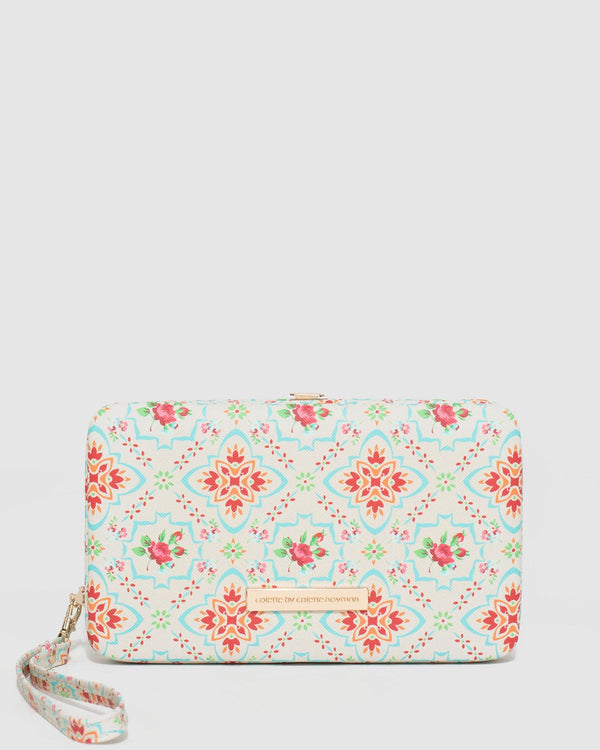 Part of our Senorita collection Print finish with gold tone hardware Saffiano textured faux leather Push lock closure 7 card slots Clear photo ID window Elasticated slot fits most phones...