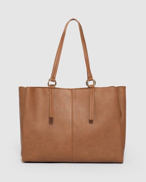 Part of our Selena Bag collection Tan finish with Gold tone hardware Pebbled pvc pvc material Detachable tassel External slip pocket Fixed handles Tan suedette lining Measurements: H37cm x W40cm...