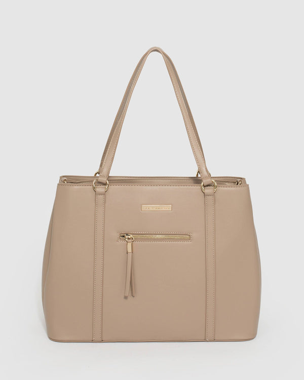 Part of our Tote Classics collection Tan finish with gold tone hardware Magnetic closure secures two separate compartments Internal zip divider compartment Internal zip and slip pocket Detachable adjustable shoulder...