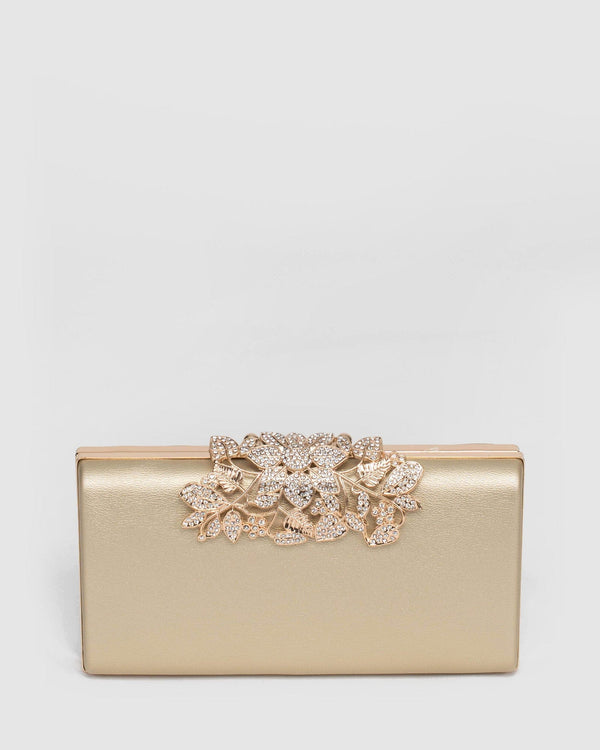 Part of our Clutch Classics collection Gold finish with gold tone hardware Textured glitter material Push lock closure Internal slip pocket Detachable chain shoulder strap Nude lining with colette by...