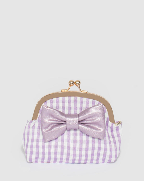 Part of our Hoppy Holidays collection Purple and white checked finish with gold tone hardware Vegan leather Clasp closure Detachable chain shoulder strap Ivory lining with colette by colette hayman...