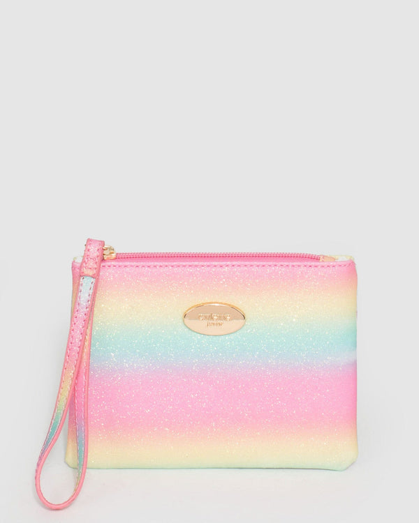 Part of our Hunny Bunny collection Multi colour finish with gold tone hardware Textured glitter finish Zip closure Internal zipped pocket Fixed wristlet strap White lining with colette by colette...