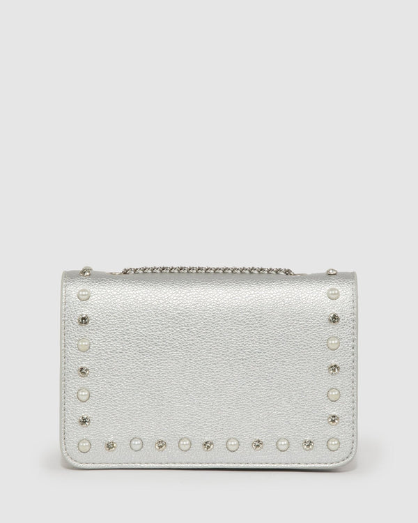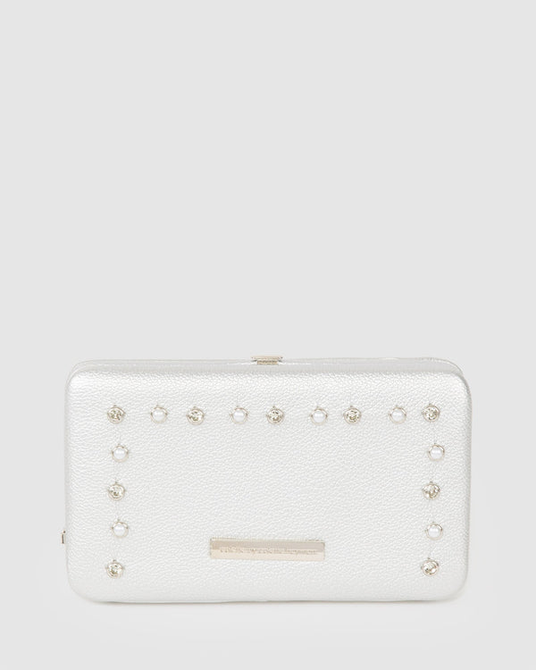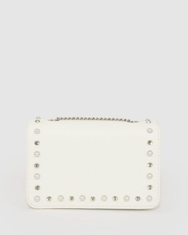Part of our Ice Queen collection White finish with Nickel tone hardware Satin finish Hardcase Fold over clasp closure Crystal and pearl detail Detachable chain crossbody strap Internal slip pocket...