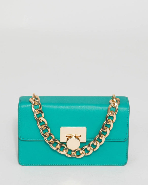 Part of our La Dolce Vita collection Aqua finish with gold tone hardware Textured faux leather Push lock closure Internal slip pocket Fixed chain top handle Detachable chain shoulder strap...