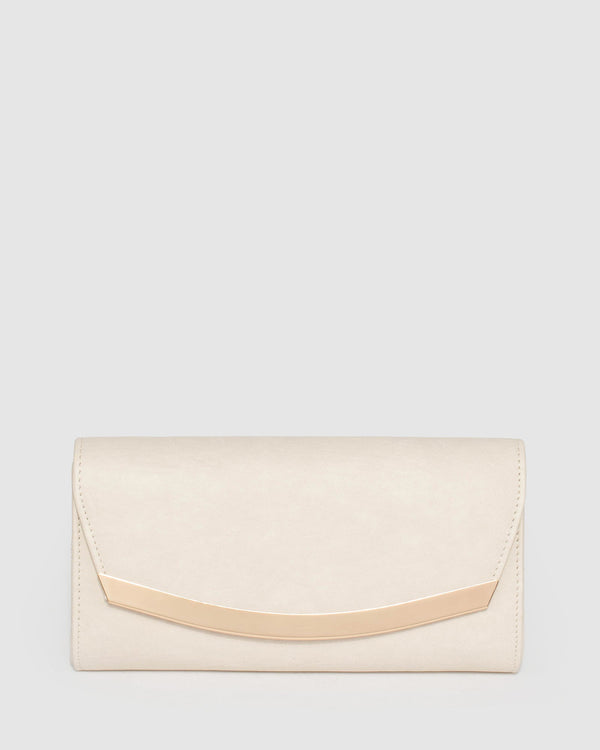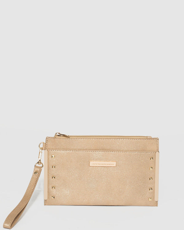 Part of our La Dolce Vita collection Gold finish with gold tone hardware Textured faux leather Zip closure External slip pocket on front Internal slip pocket Detachable wristlet strap Ivory...