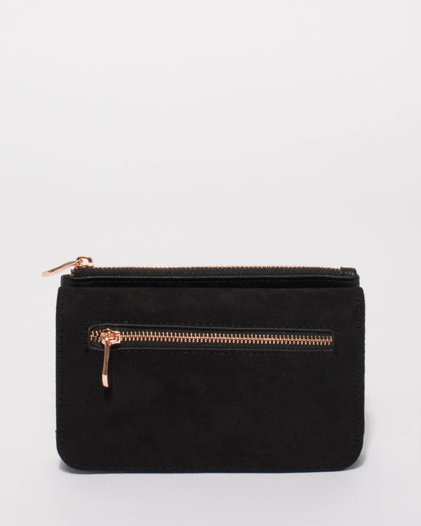 Part of our Black collection Black finish with rose gold tone hardware Smooth with suedette textured pu material Magnetic dot opens to main compartment 7 card slots 3 slip slots External...