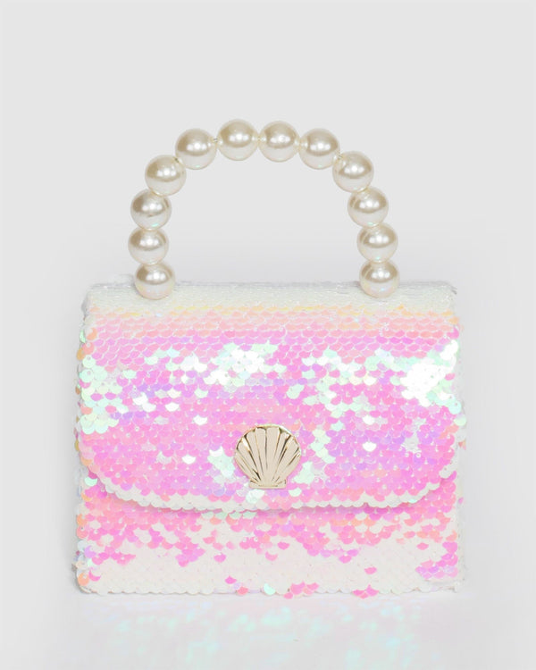 Part of our Little Mermaid collection Pink sequin finish with gold tone hardware Metallic closure Detachable chain shoulder strap Internal slip pocket Pink lining with colette by colette hayman branding...