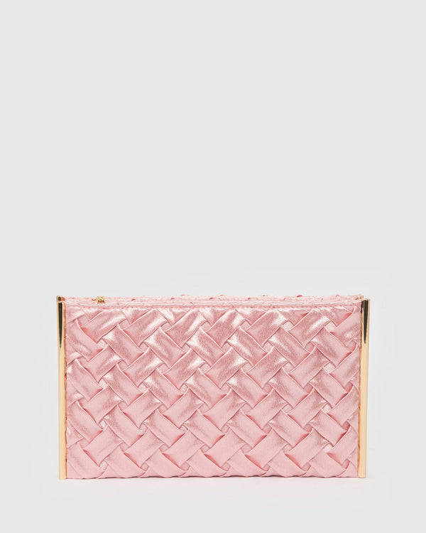 Part of our Clutch Classics collection Pink finish with gold tone hardware Smooth textured vegan leather Magnetic dot secures fold over flap Internal slip pocket Detachable chain shoulder strap Pink nylon lining with...