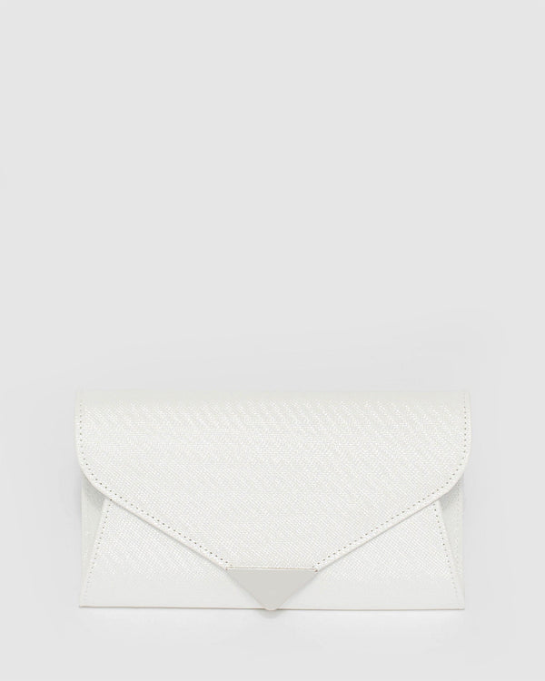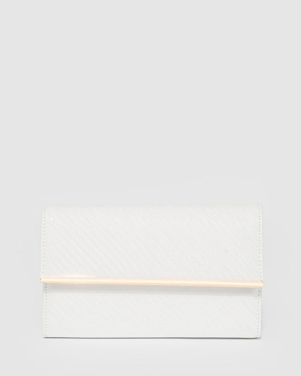 Part of our Malibu Babe collection White glitter finish with gold tone hardware Vegan leather Magnetic closure Internal slip pocket Detachable chain shoulder strap White lining with colette by colette hayman...