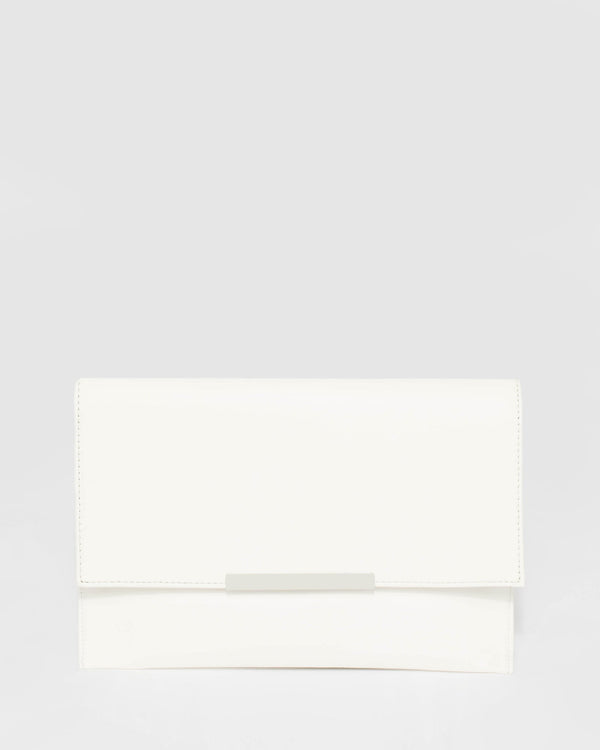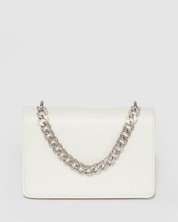 Part of our Malibu Babe collection White finish vegan leather Silver tone hardware Magnetic closure Internal zip pocket Detachable chain shoulder strap White nylon lining with colette by colette hayman...