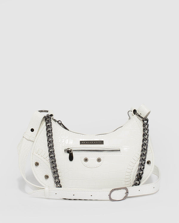 Part of our Malibu Babe collection Croc textured vegan leather White finish with silver tone hardware External zip closure and zip pocket Internal zip and slip pockets Adjustable shoulder strap White lining...