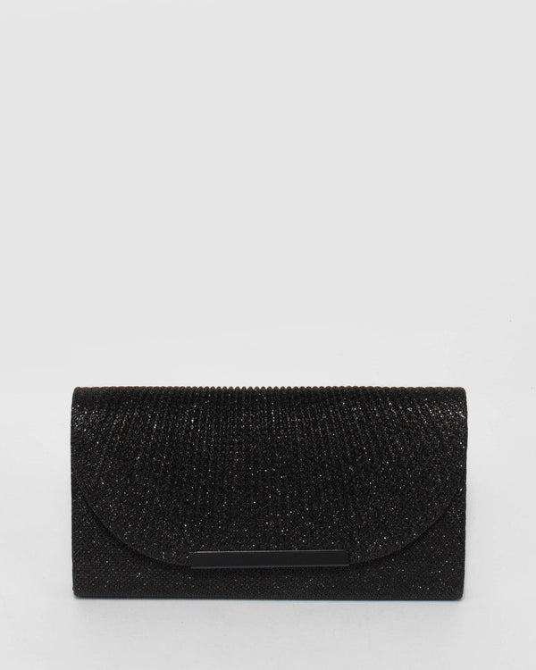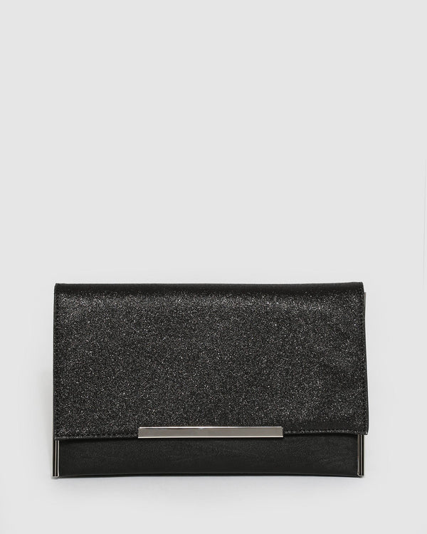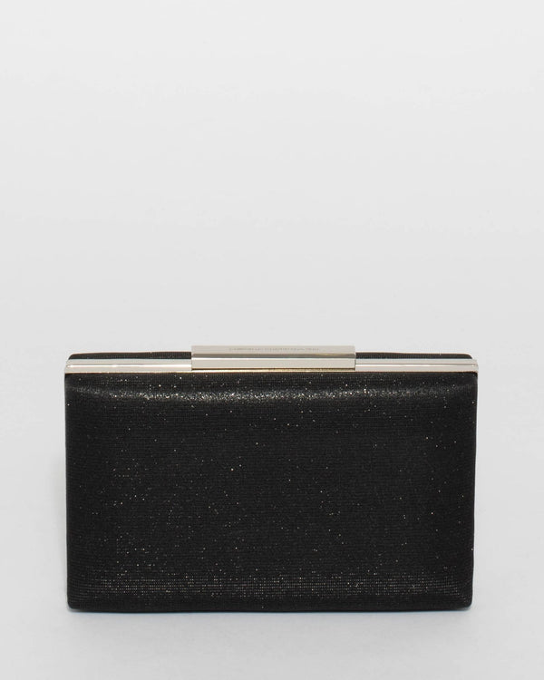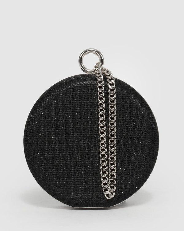 Part of our Midnight Dance collection Black finish with silver tone hardware Glitter texture Push lock closure Detachable chain shoulder strap Fixed chain wristlet strap Black lining with colette by colette...