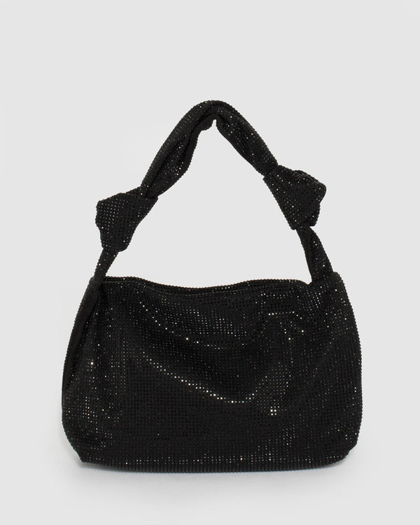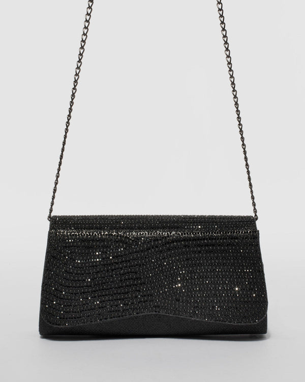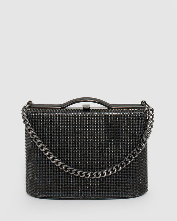 Part of our Black Sparkle collection Black finish with gunmetal tone hardware Diamante embellished finish Push lock closure Internal slip pocket Detachable chain shoulder strap Fixed hand held chain Black lining...