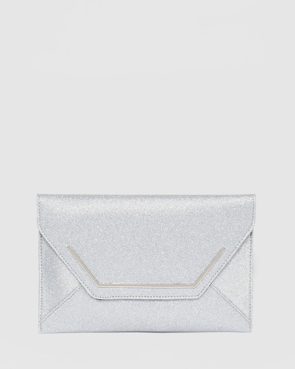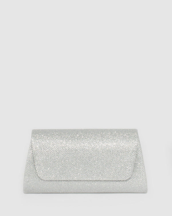 Part of our Midnight Dance collection Silver finish with silver tone hardware Glitter material Magnetic closure Internal slip pocket Detachable chain shoulder strap Black nylon lining with colette by colette...
