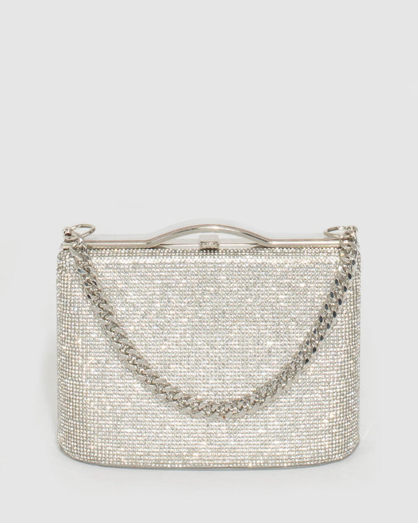 Part of our Silver Sparkle collection Silver finish with silver tone hardware Diamante embellished finish Push lock closure Internal slip pocket Detachable chain shoulder strap Fixed hand held chain Black lining...
