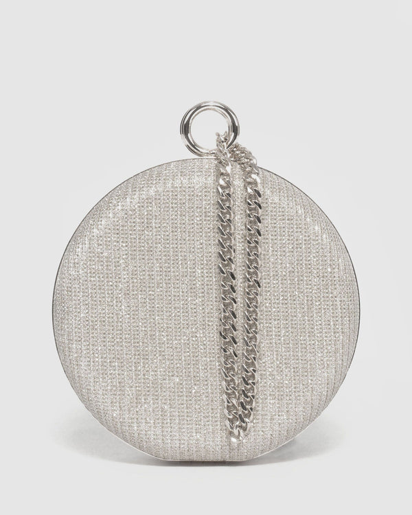 Part of our Midnight Dance collection Silver finish with silver tone hardware Textured glitter material Push lock closure Detachable chain shoulder strap Fixed chain wristlet strap White lining with colette...