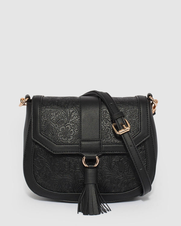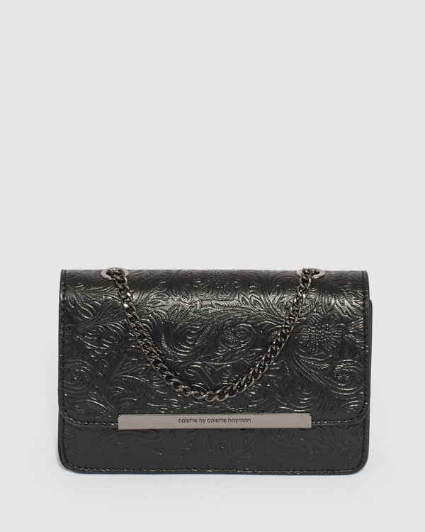 Part of our Paisley Boss collection Black finish with gunmetal tone hardware Embossed faux leather Magnetic closure Zipped compartment secured by foldover flap 2 Internal card slots Fixed chain shoulder strap...