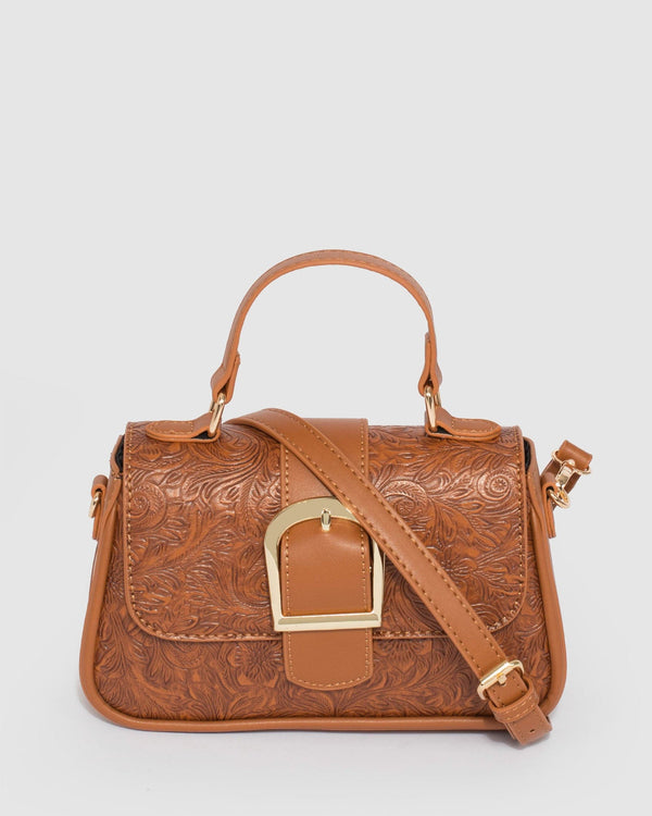 Part of our Bossing it collection Tan finish with gold tone hardware Embossed faux leather Fold over flap with magnetic closure Internal zip and slip pockets Detachable adjustable shoulder strap...