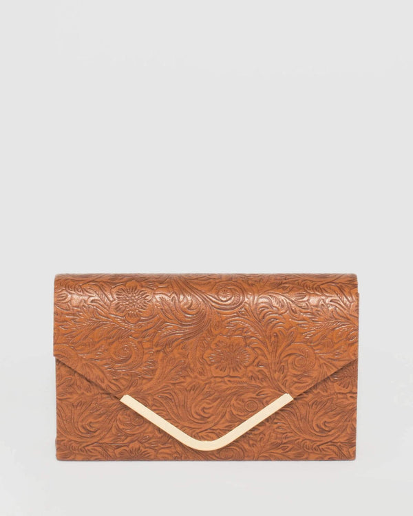 Part of our Paisley Boss collection Tan finish with gold tone hardware Embossed faux leather Magnetic closure Internal slip pocket Detachable chain shoulder strap Black lining with colette by colette hayman...