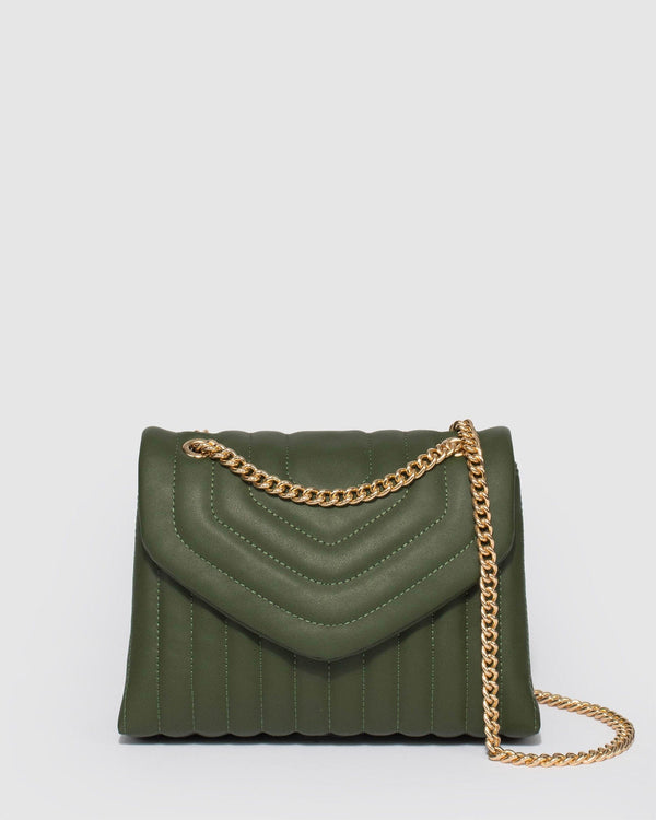 Part of our Refined Nature collection Green finish with gold tone hardware Vegan leather Adjustable chain shoulder strap- can be used as a crossbody or shoulder bag! Metallic closure Two internal...