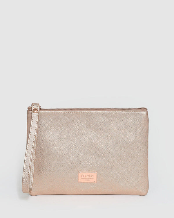 Part of our Late Nights collection Rose Gold finish with rose gold tone hardware Saffiano faux leather Zip closure Fixed wristlet strap Ivory lining with colette by colette hayman branding...