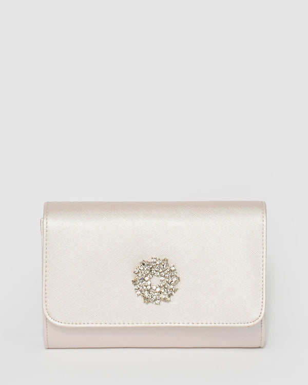 Part of our Clutch Classics collection Gold finish with gold tone hardware Embellished textured pu material Push lock clasp secures main compartment Internal slip pocket Detachable chain shoulder strap Ivory...