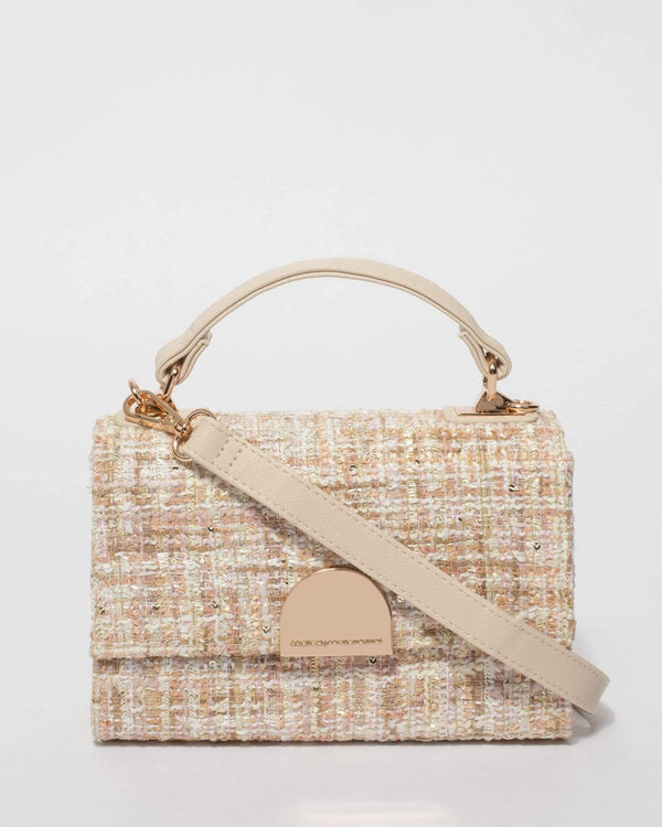 Part of our Sea Shore collection Pink finish with gold tone hardware Tweed material Magnetic closure Internal zipped pocket Detachable adjustable shoulder strap Ivory nylon lining with colette by colette...
