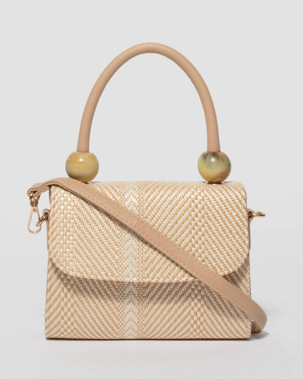 Part of our Crossbody Classics collection Tan finish with gold tone hardware Chevron vegan leather Detachable tassel Double zip closure Internal pocket with 3 card slots Adjustable shoulder strap Caramel nylon lining with colette by colette hayman branding...