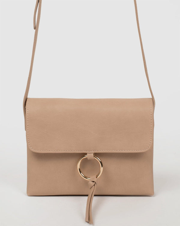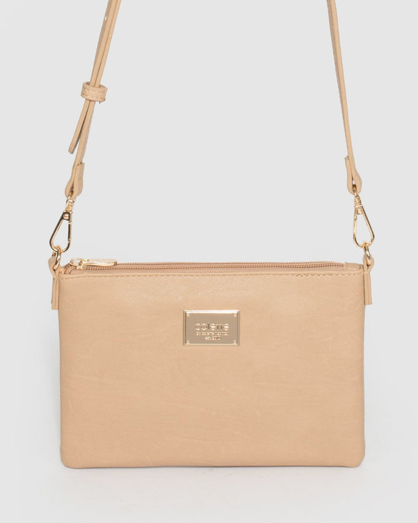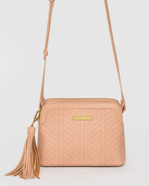 Part of our Crossbody Classics collection Nude finish with gold tone hardware Textured faux leather Zip closure 2 Compartments Internal 3 card slots Internal zipped pocket Removable tassel Fixed adjustable...