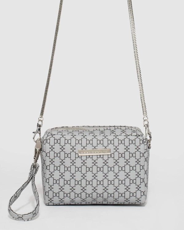 Part of our Monogram Fam collection Monogram finish with silver tone hardware Saffiano faux leather Zip closure Detachable wristlet strap Detachable snake chain shoulder strap Black lining with colette by...