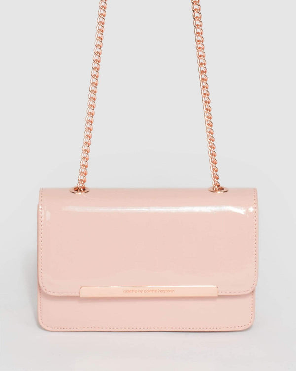 Part of our Lauren collection Pink finish with rose gold tone hardware Patent textured PU material Magnetic closure Internal zipped compartment 2 card slots Fixed shoulder strap Pink lining with...