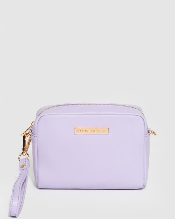 Part of our Soft Lilac collection Purple finish with gold tone hardware Smooth faux leather Zip closure Detachable wristlet strap Detachable snake chain shoulder strap Ivory lining with colette by colette...