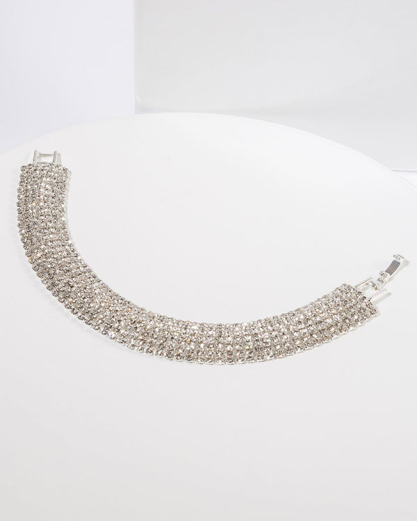 Part of our Silver Sparkle collection Silver finish with silver tone hardware Diamante embellished finish Push lock closure Internal slip pocket Detachable chain shoulder strap Fixed hand held chain Black lining...
